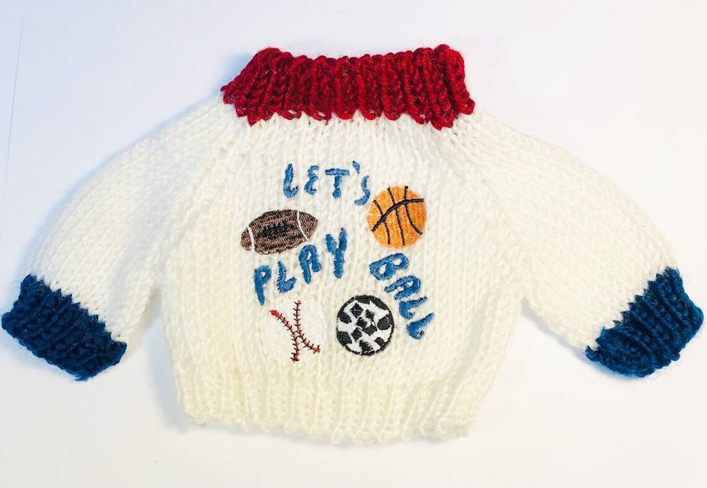 This acrylic blend, fun Sports Theme embroidered knit sweater will fit just about any doll, plush or stuffed animal from 8" to 13" tall. The materials in the acrylic sweater are safe, washable and the colors will not fade or run in the wash.